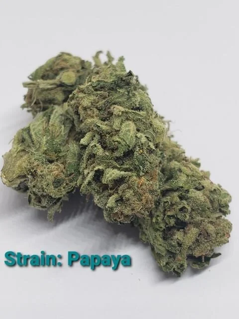 The Papaya cannabis strain is classified as an indica, and its aroma beautifully mirrors its name, offering a sweet and tropical scent with subtle hints of pepper and spice. Its buds are characterized by their fluffy, blade-shaped appearance and vibrant green coloration.