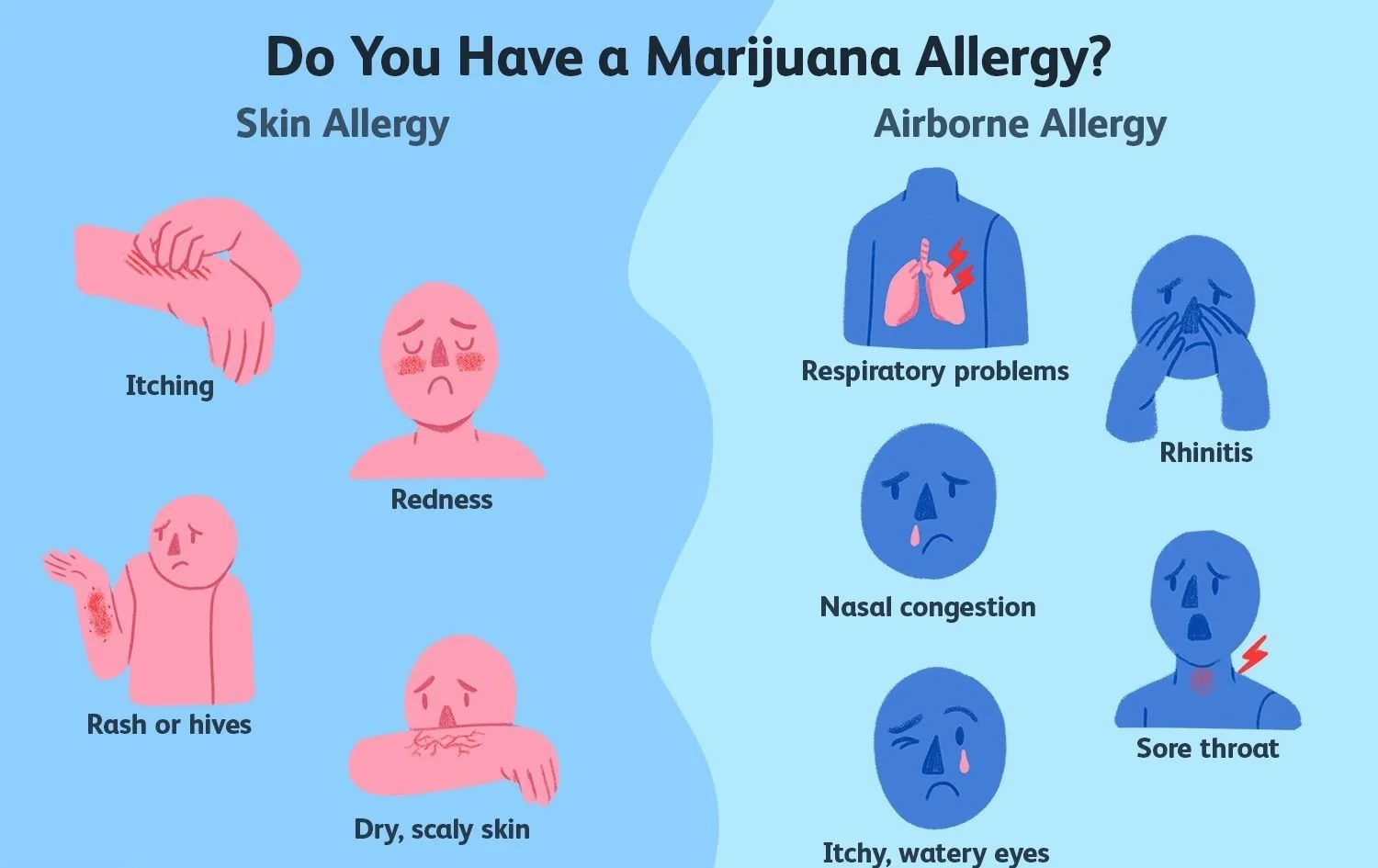 Smoking, vaping, inhaling, or touching marijuana, a pollen-bearing plant, for either medical or recreational use could be a cause of various allergies in some individuals. Some people have reactions where their asthma may flare up, or they may exhibit symptoms like nasal congestion, eye inflammation, coughing, wheezing, sneezing, or skin conditions like eczema or hives.